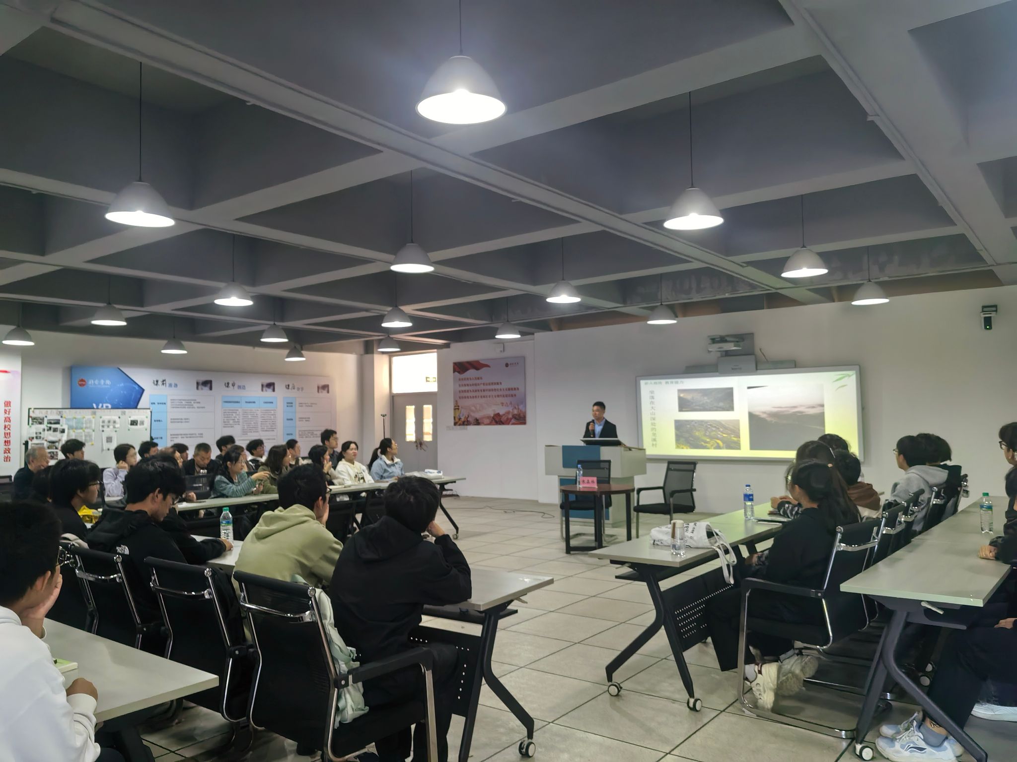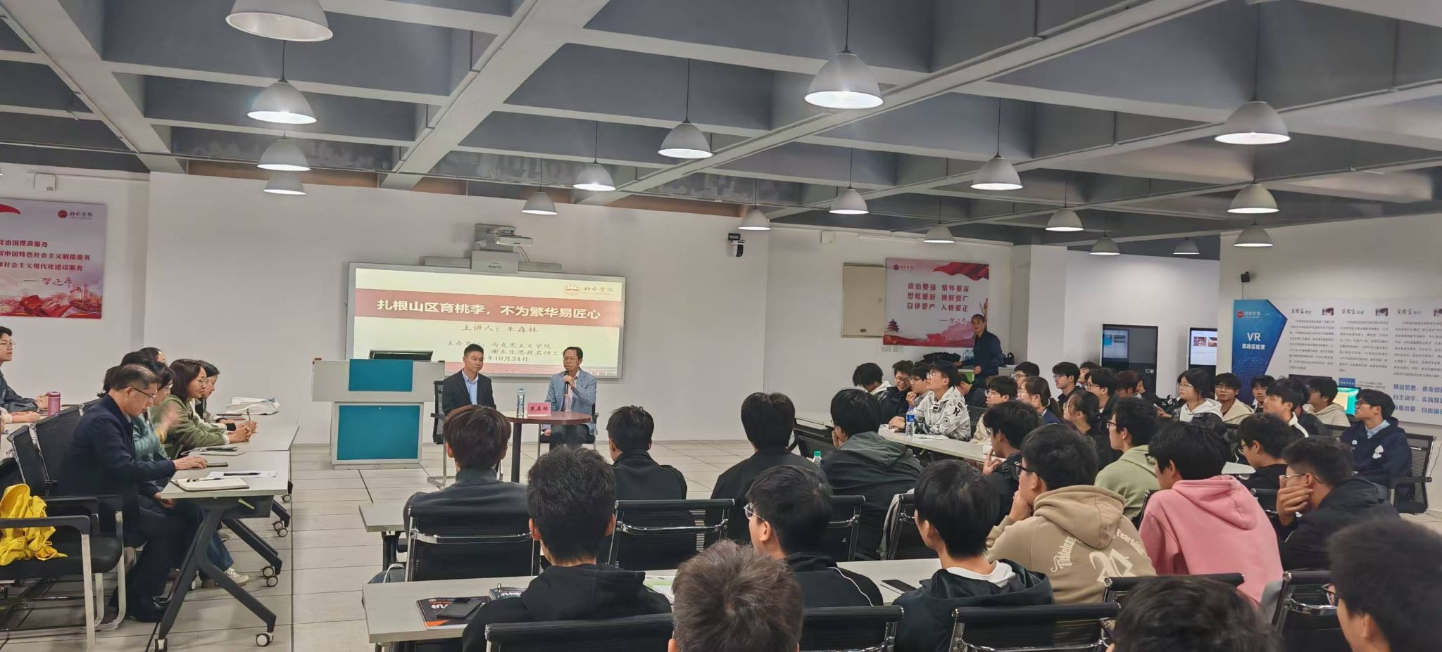 为深入贯彻落实习近平总书记关于“大思政课”建设的重要指示精神,充分发挥优秀校友在思想政治教育中的榜样示范与价值引领作用,2025年10月24日上午,新余学院谢禾生思政课名师工作室以“扎根山区育桃李,不为繁华易匠心”为主题,创新开展校友思政教育实践活动,特别邀请优秀校友、“江西省优秀特岗教师”朱森林返校分享其坚守海拔800米“云端小学”的育人故事。马克思主义学院全体教师与2025级机械制造专业学生代表现场参与,共同聆听乡村教育一线的感人故事,感悟新时代教师的责任与担当。