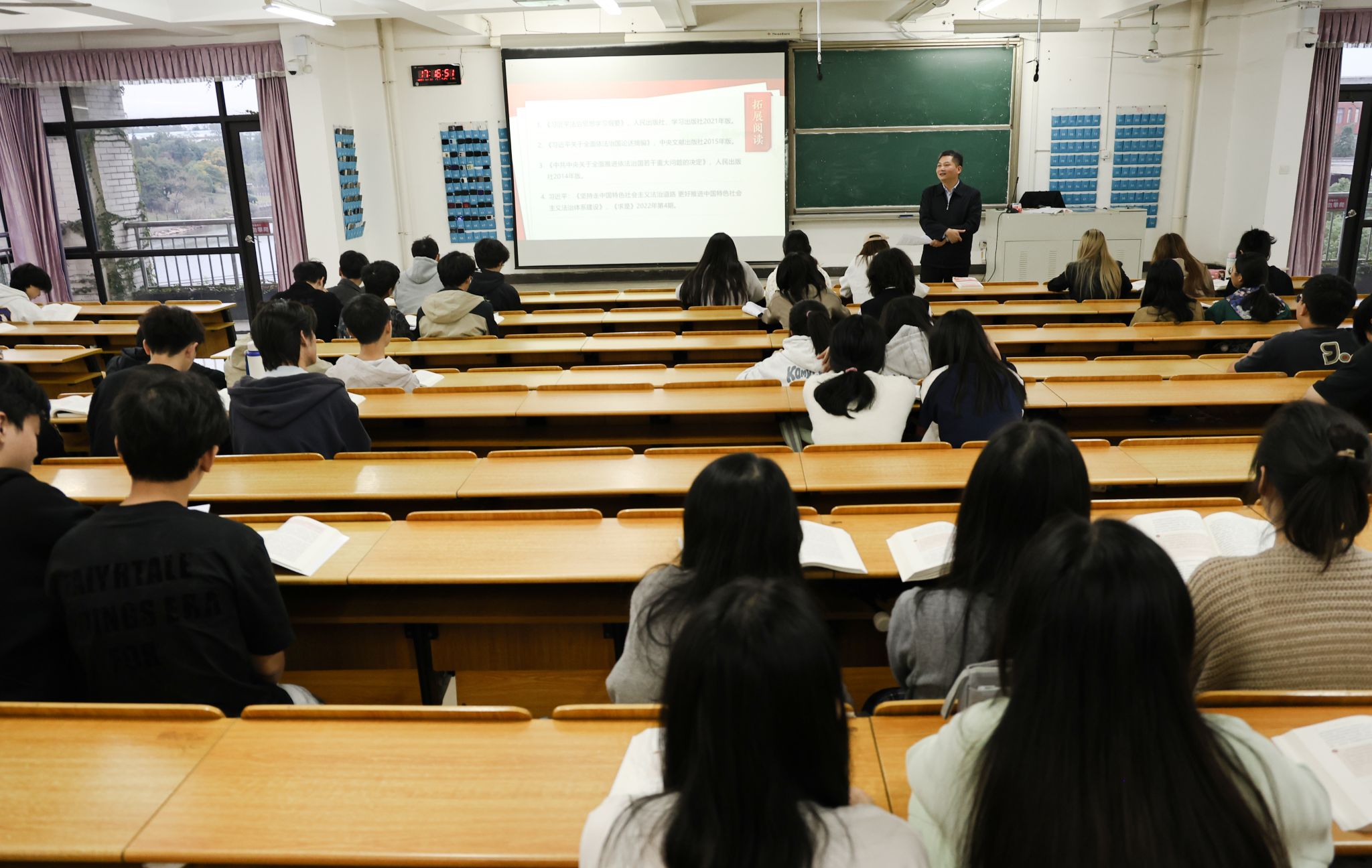 11月21日下午,校党委书记伍复康在主教学楼 C座多媒体16教室,以“建设社会主义文化强国”为主题,为2024级软件工程专业学生讲授思政课。