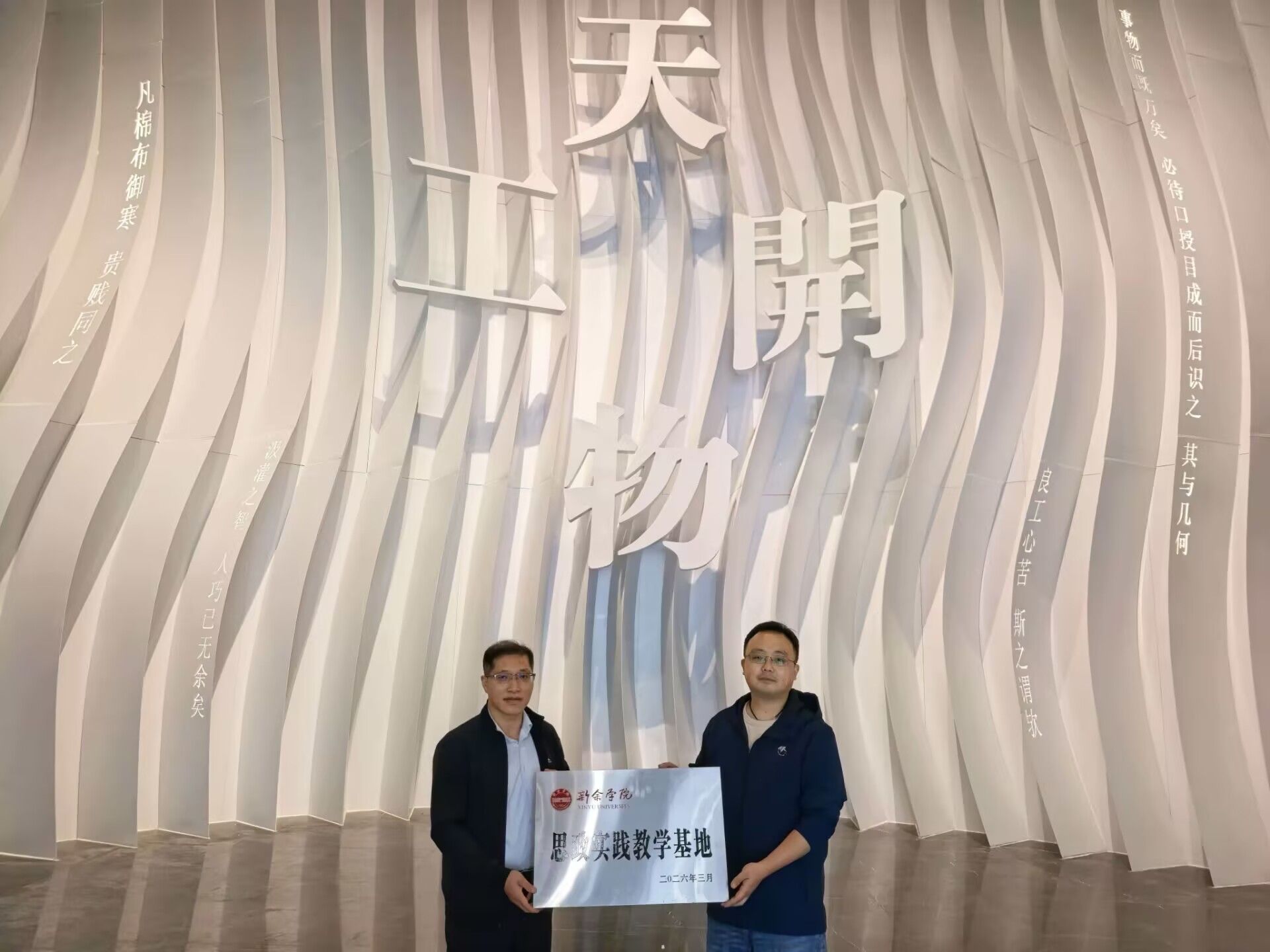 4月22日下午,我院与分宜县博物馆共建思政实践教学基地授牌仪式在天工开物陈列馆举行。为深化思政课理论与实践相融合,丰富思政课实践教学元素,提升文化育人实效,马克思主义学院积极拓展教学实践资源,与分宜县博物馆所属的天工开物陈列馆、分宜县麻博馆洽谈对接,签订了双方共建思政实践教学基地协议,有效实现资源共享、发挥传统文化育人效果,共同开展天工开物思政项目申报,开展思政课程现场教学,拓展思政可实践教学效果。