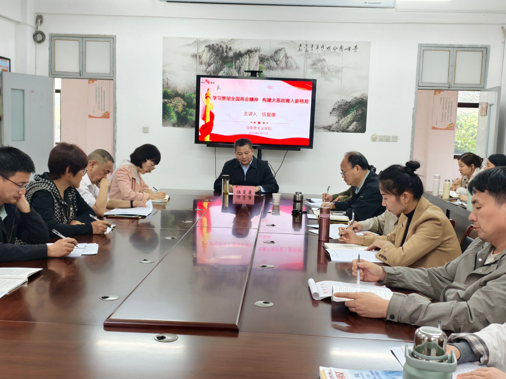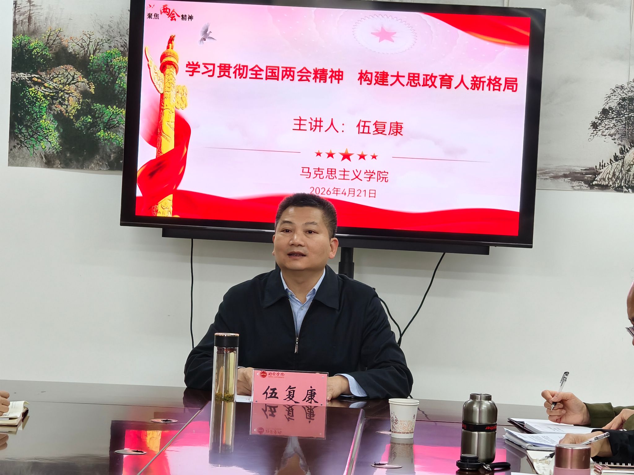 2026年4月21日,校党委书记伍复康深入我院,开展2026年全国两会精神专题宣讲。我院班子成员、全体思政课教师参加学习。