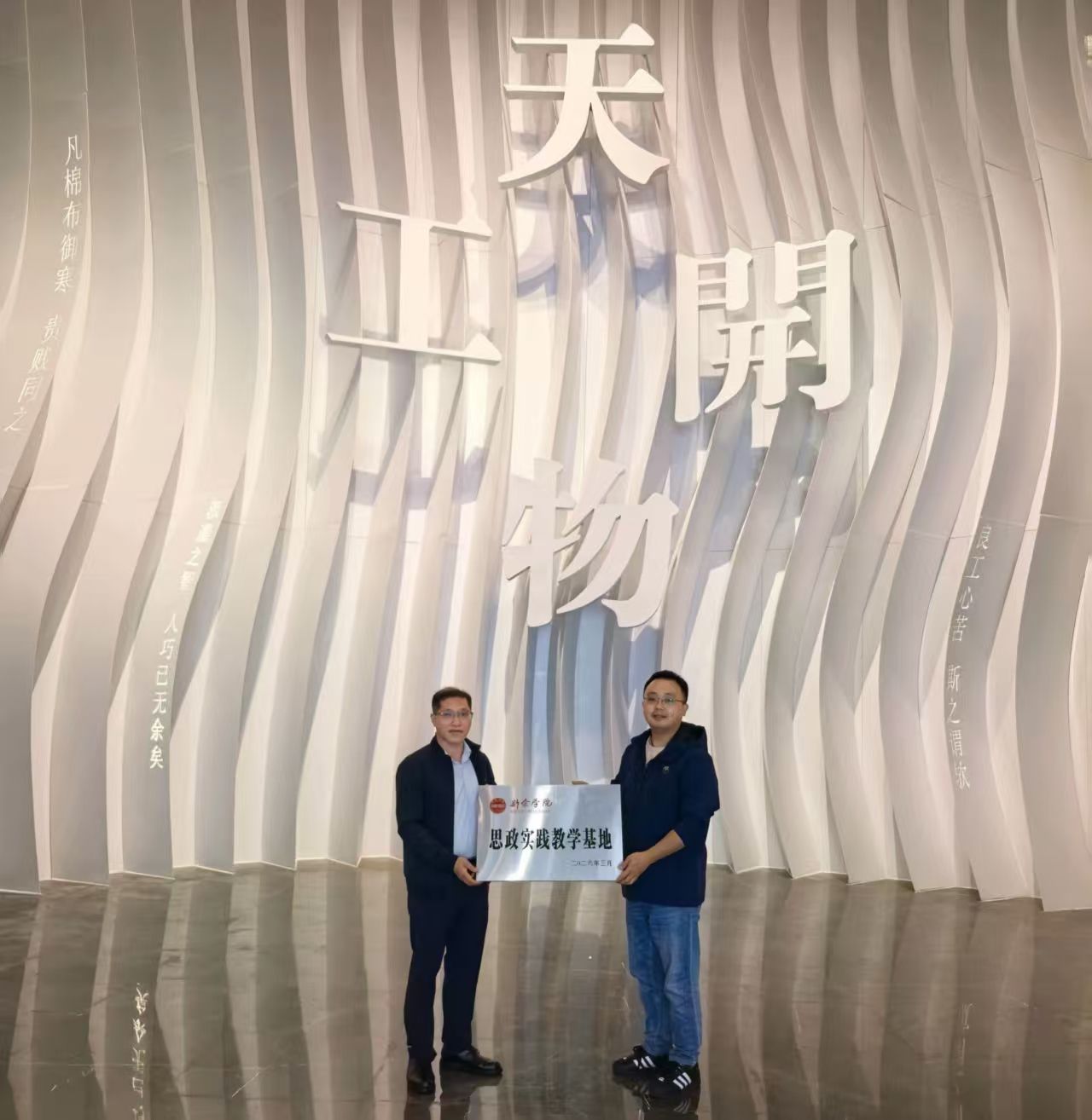 4月22日下午,我院与分宜县博物馆共建思政实践教学基地授牌仪式在天工开物陈列馆举行。为深化思政课理论与实践相融合,丰富思政课实践教学元素,提升文化育人实效,马克思主义学院积极拓展教学实践资源,与分宜县博物馆所属的天工开物陈列馆、分宜县麻博馆洽谈对接,签订了双方共建思政实践教学基地协议,有效实现资源共享、发挥传统文化育人效果,共同开展天工开物思政项目申报,开展思政课程现场教学,拓展思政可实践教学效果。